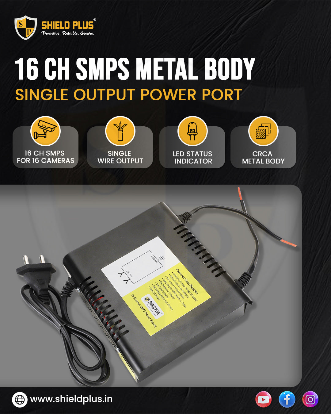 Product Description: This 16-channel SMPS is designed to power up to 16 CCTV cameras effectively. It features two single wire outputs to ensure hassle-free and organized installation. The unit includes an LED indicator to display operational status clearly. Constructed from sturdy CRCA metal with powder coating, it provides excellent durability and protection against overload, overvoltage, overcurrent, short circuit, and overheating—ensuring stable and reliable performance for your surveillance needs.