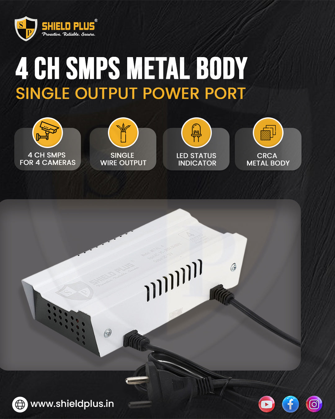 Product Description: 4ch SMPS for 4 Cameras. Single Wire Output for Hassle-free Installation. LED indicator to show the functional status. Metal Body made from CRCA Sheet with Powder Coating. Overload, Over Voltage and Over Current Protection. Short Circuit and Over Temperature Protection.