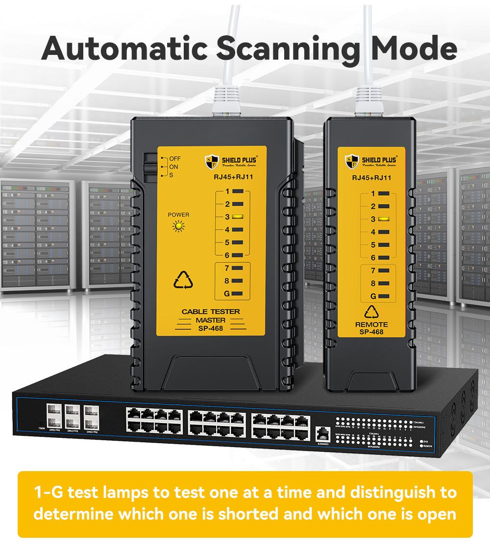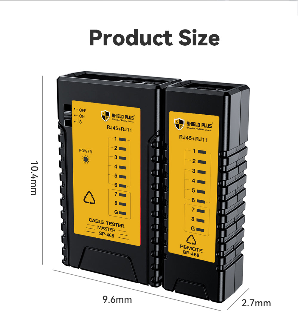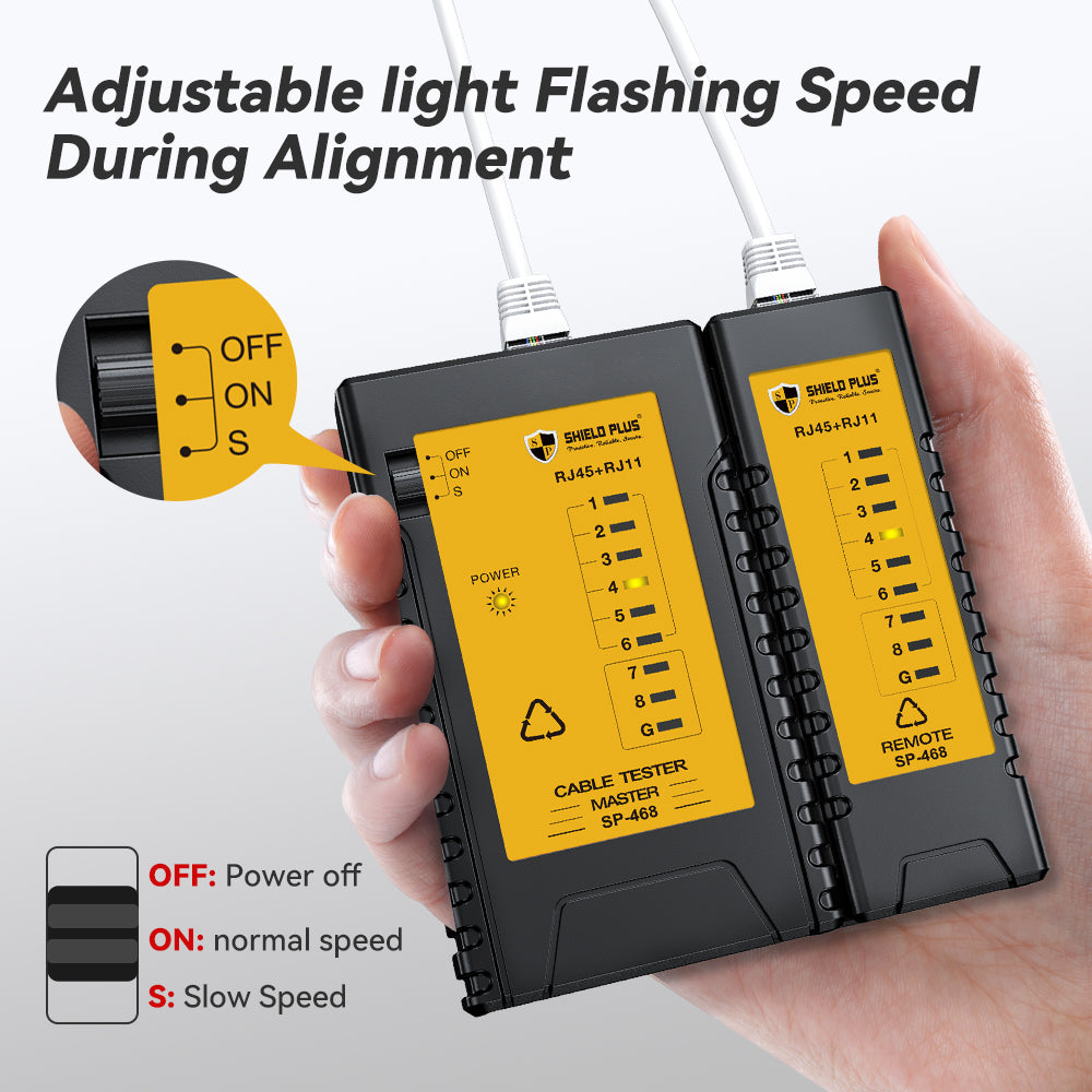 The SP-468 Cable Continuity Tester provides essential testing functions for RJ11 and RJ45 cables with clear LED indicators and multiple test modes. Designed with a separable transmitter and receiver, it supports double-twisted cable testing for wires 1–8 and Ground, with burnout-proof voltage endurance up to DC 60V. Equipped with CE/ROHS/REACH certifications, this model includes slow and fast test switches and supports long-distance testing with a detachable remote unit.