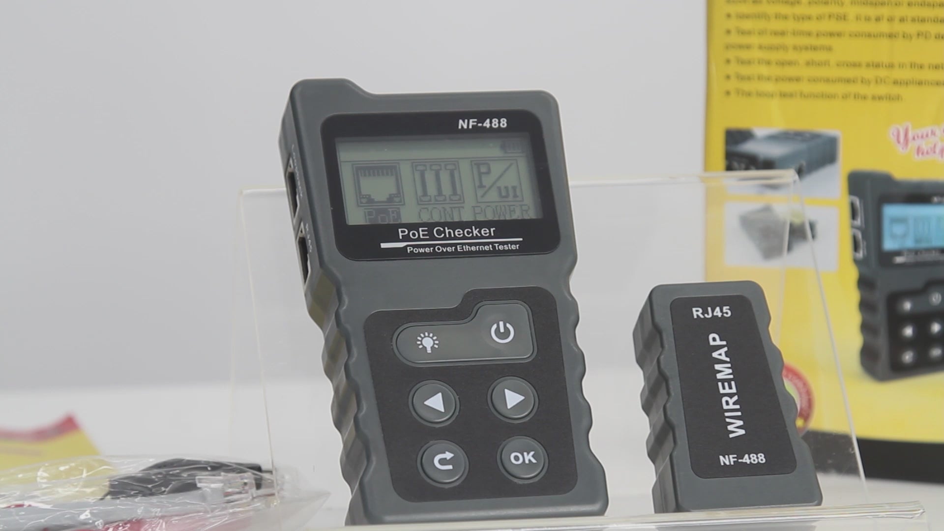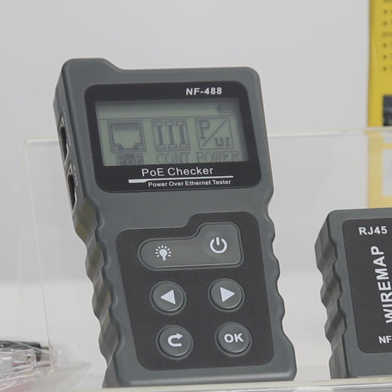 Designed for network professionals, the Professional PoE Network Tester is a compact and reliable tool that helps verify and troubleshoot Power over Ethernet connections. It supports detection of IEEE802.3af/802.3at standards, and offers inline power testing to check voltage, polarity, and crossover. Cable continuity testing helps identify shorts, opens, and crossover wiring issues, while loopback testing verifies switch loop circuits. For added convenience, the built-in lamp allows use in low-light environments. This tester is RoHS, FCC, and CE certified for safe and reliable performance.