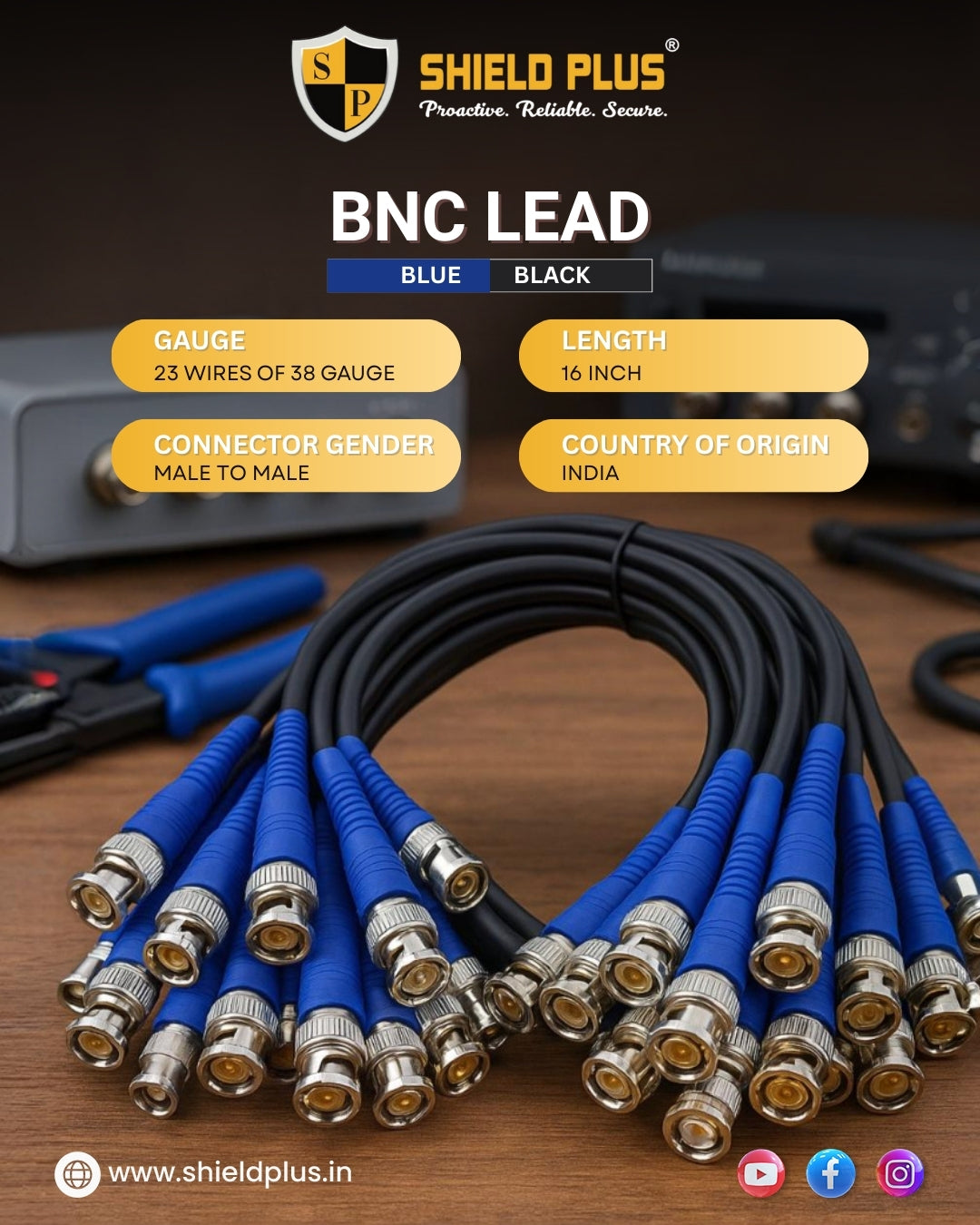 The Shield Plus SP-BNC Lead is a premium-quality, high-performance connector cable designed for seamless signal transmission across various professional applications. Constructed using 100% copper wiring and precision-engineered connectors, this lead offers reliable performance, minimal signal loss, and long-lasting durability. Available in four vibrant color combinations—Blue-Black, Yellow-Black, Orange-White, and Yellow-White—these male-to-male leads are ideal for surveillance systems, broadcasting setups, telecommunications, and test instrumentation.