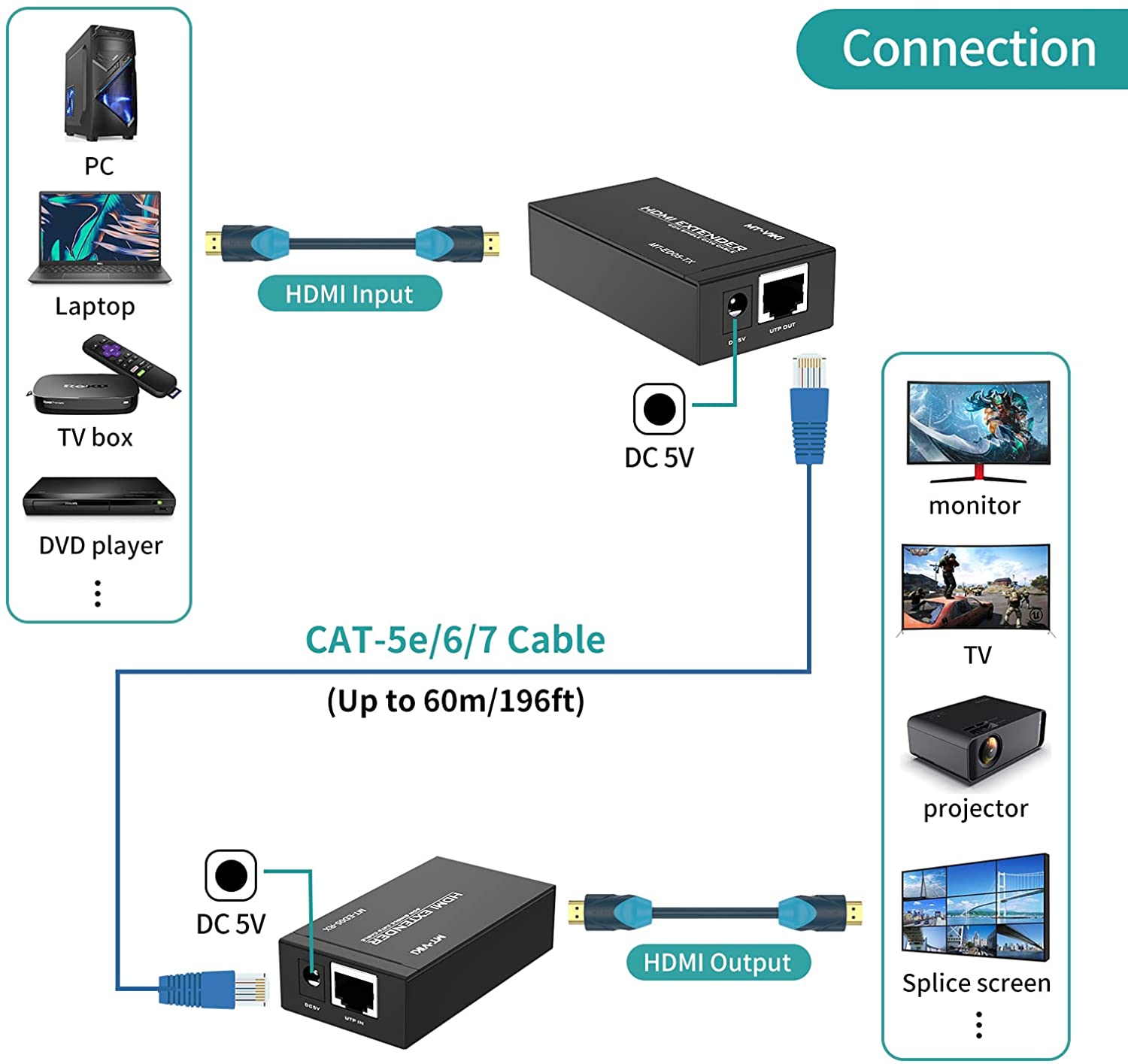 ✅ 50M Signal Extension via CAT6: Transmit HDMI signals up to 50 meters using a single Cat-5e or Cat-6 cable (recommended CAT6). Eliminates the need for expensive HDMI cables over long distances.