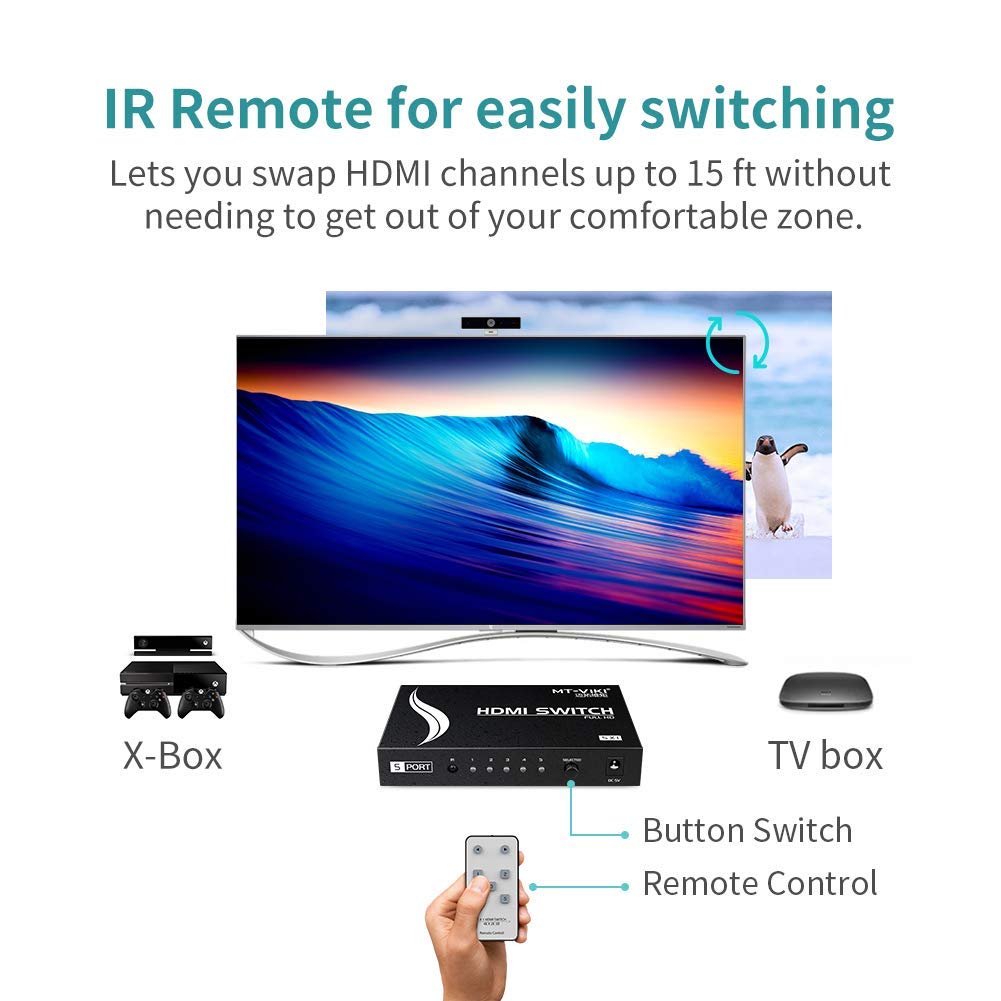 - Connect up to 5 HDMI devices to 1 HDMI display