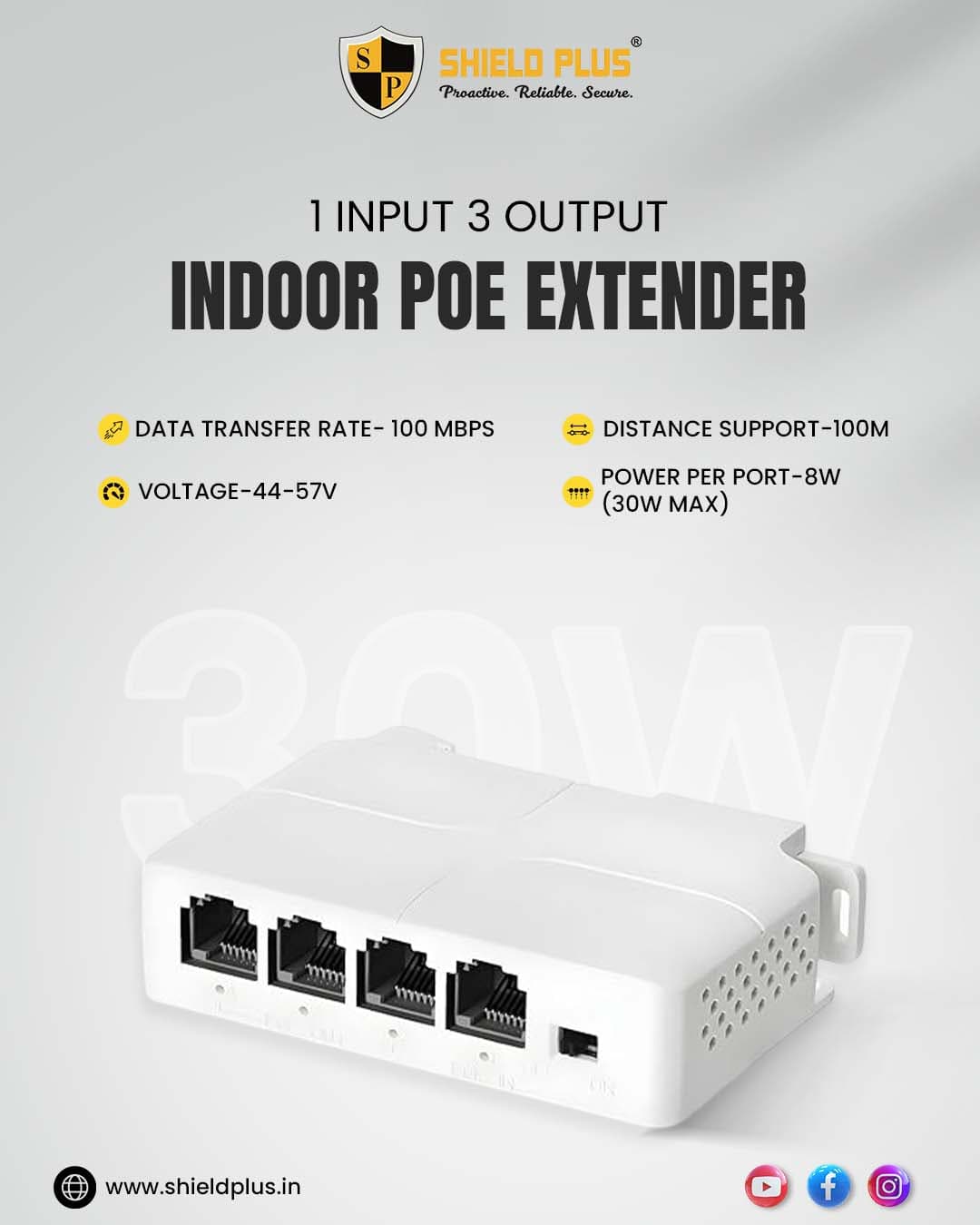 The SP-Indoor PoE Extender 1 Input 3 Output is designed to efficiently extend your PoE network, providing 100 Mbps data transfer across 3 output ports. It supports a maximum distance of 100 meters, ensuring flexible device placement in larger installations.